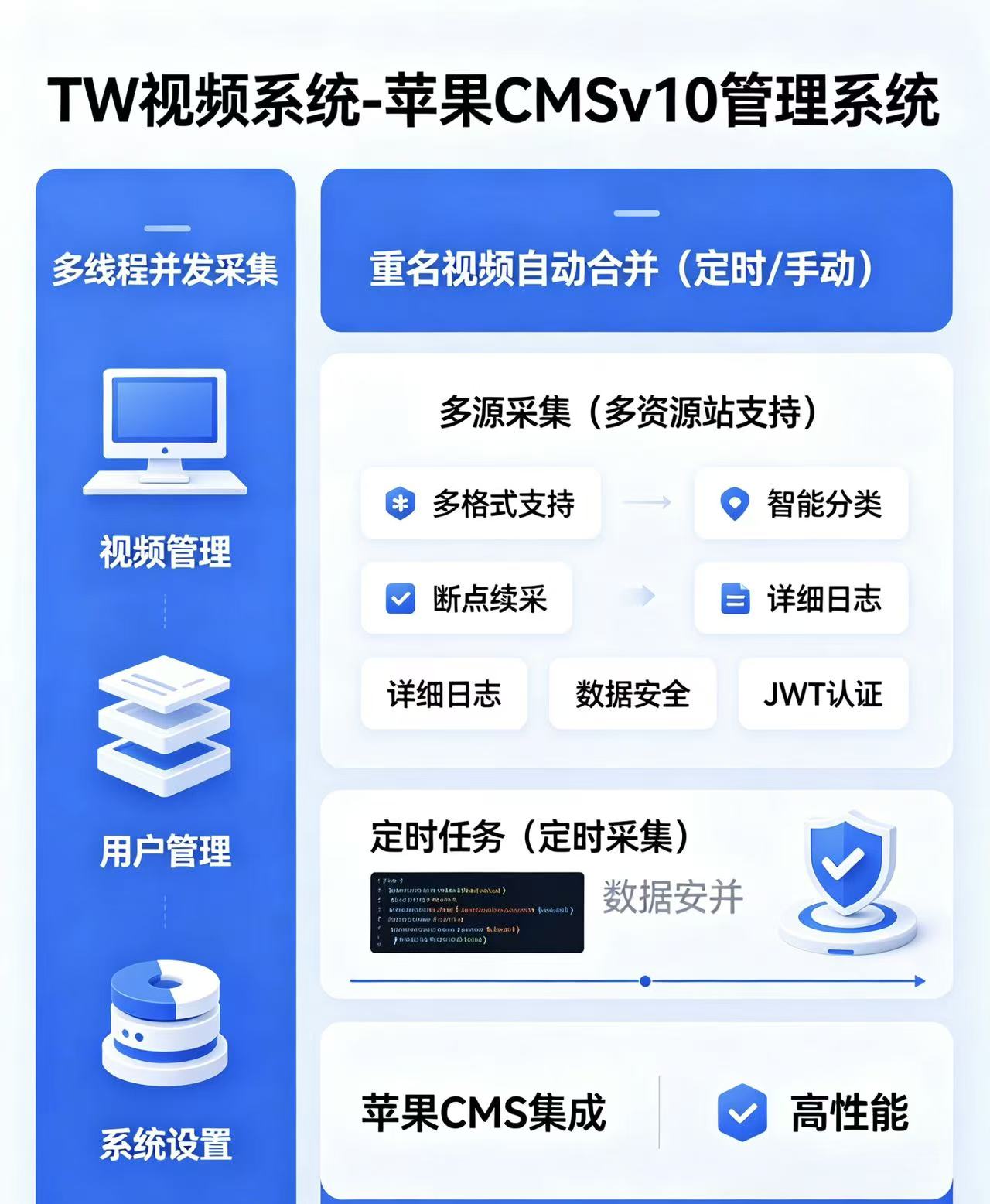 简介:管理苹果CMS视频数据,支持多线程并发视频采集、视频管理、用户管理和系统设置。系统支持从多个资源站采集视频数据,并支持重名视频自动合并、定时合并与手动合并视频,特别解决了苹果CMS原始采集速度慢和重名视频数据的问题。